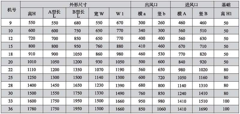 注:1. A型風機箱的電機機座號大于等于160,則電機放在風機側面或F面,機座號小于等于132,則電機放在風機上面(如外形尺寸圖);