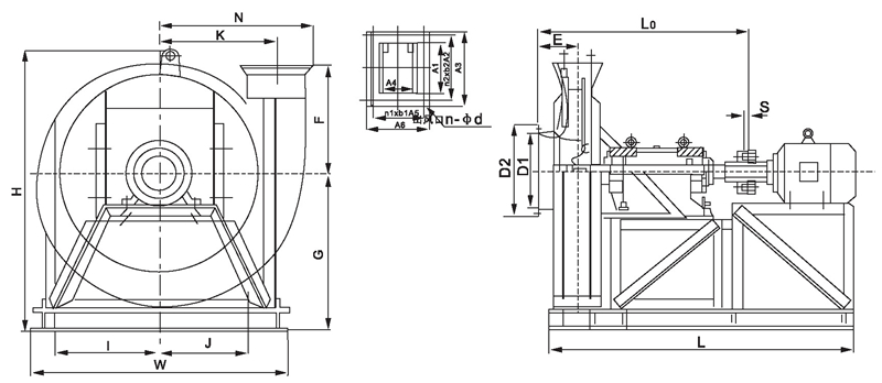 9-19、9-26系列7.1D~16D離心風(fēng)機(jī)外形尺寸圖、表