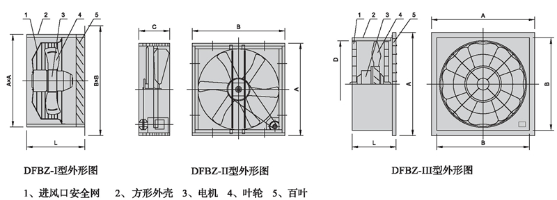 DFBZ-I型為采用內(nèi)轉(zhuǎn)子電機(jī)直聯(lián)傳動結(jié)構(gòu)形式、DFBZ-Ⅱ型采用內(nèi)轉(zhuǎn)子電機(jī)、皮帶傳動結(jié)構(gòu)形式,DFB-Ⅲ型為采用外轉(zhuǎn)子電機(jī)直聯(lián)傳動結(jié)構(gòu)形式。可根據(jù)用戶要求制威防腐防爆型。